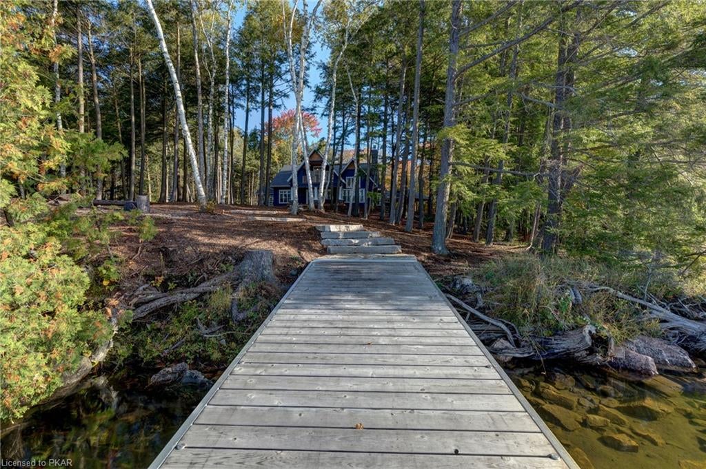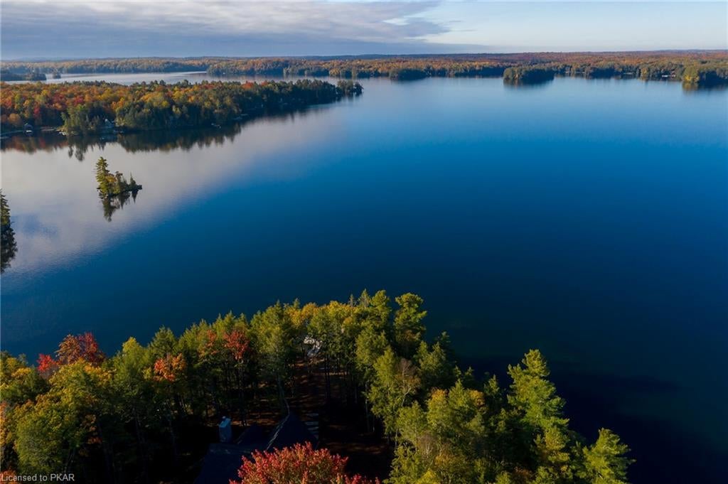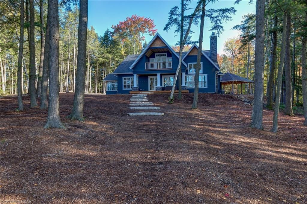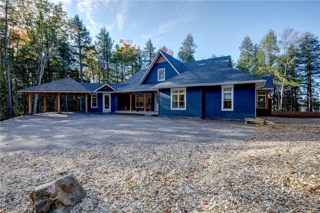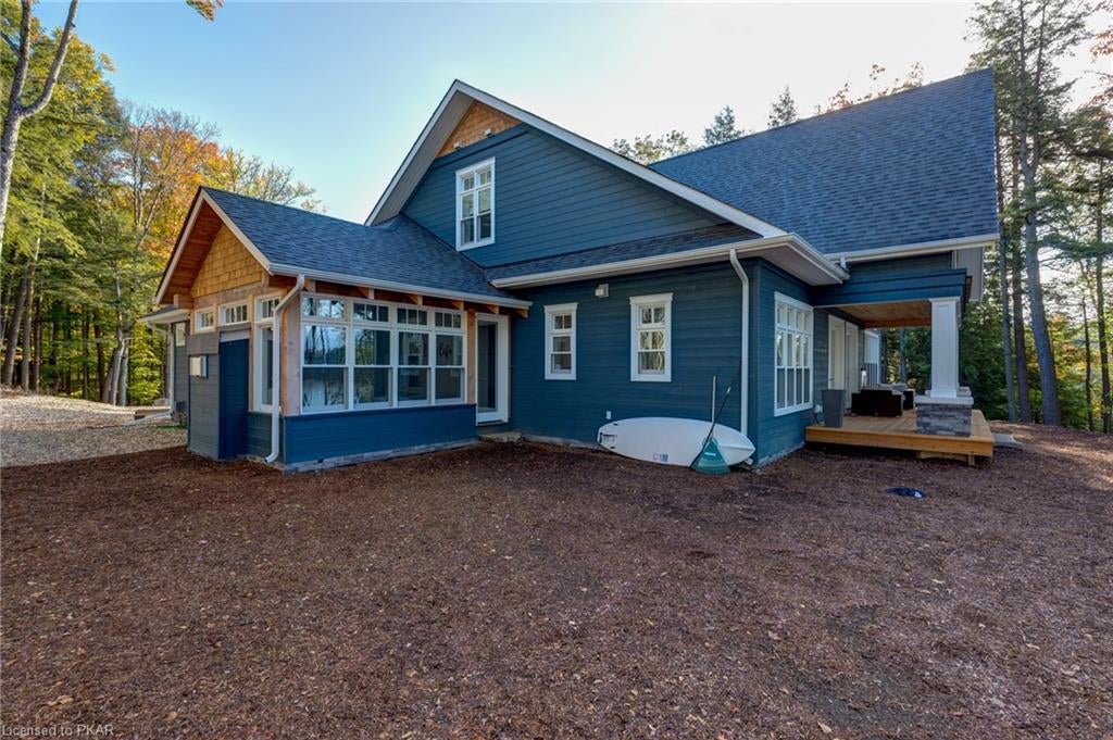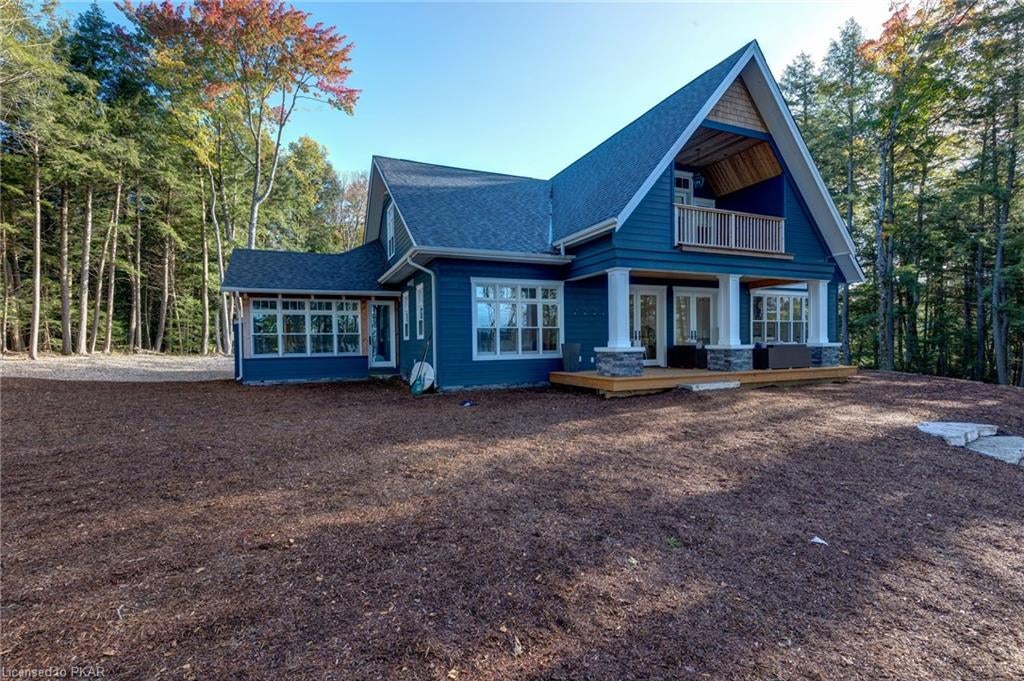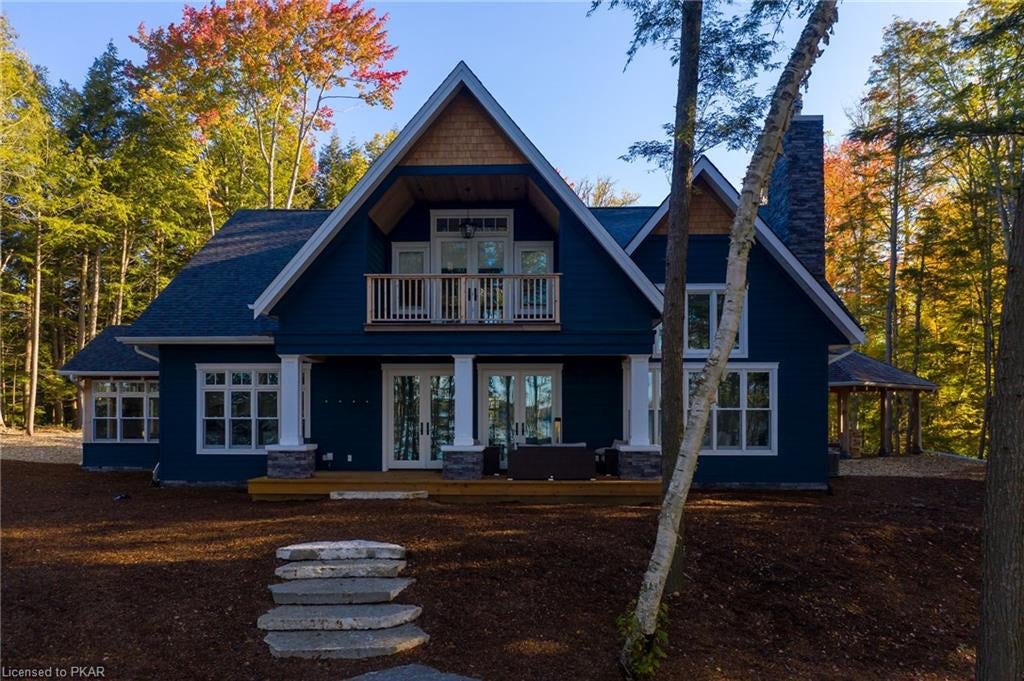 Nestled in the woods you will find a spectacular new 4 season cottage/ home. A gently sloping lot offers extreme privacy with 8.6 acres and 830 feet of excellent water frontage with western exposure. This new build boasts open concept living with a vaulted ceiling and stone fireplace. The spacious custom designed kitchen has all new top of the line Subzero and Wolf appliances, quartz counter tops, ceramic back splash, and under cabinet low voltage lighting. A spacious dining area and access to a beautiful three season room with gas fireplace complete the living space. Also on the main floor is the laundry area complete with a dog washing station, interior access to the large carport, three large bedrooms and 2.5 bathrooms. The second floor offers a large primary suite with a large bedroom, walk in closet, lakeside deck, and a beautiful primary en suite with a separate toilet closet.