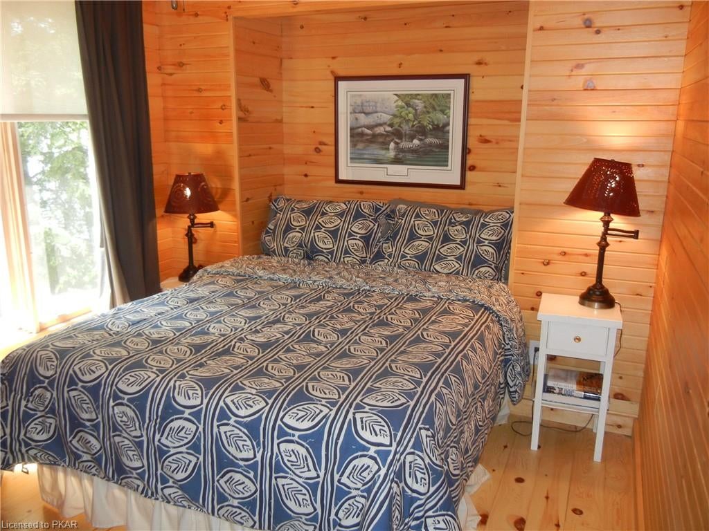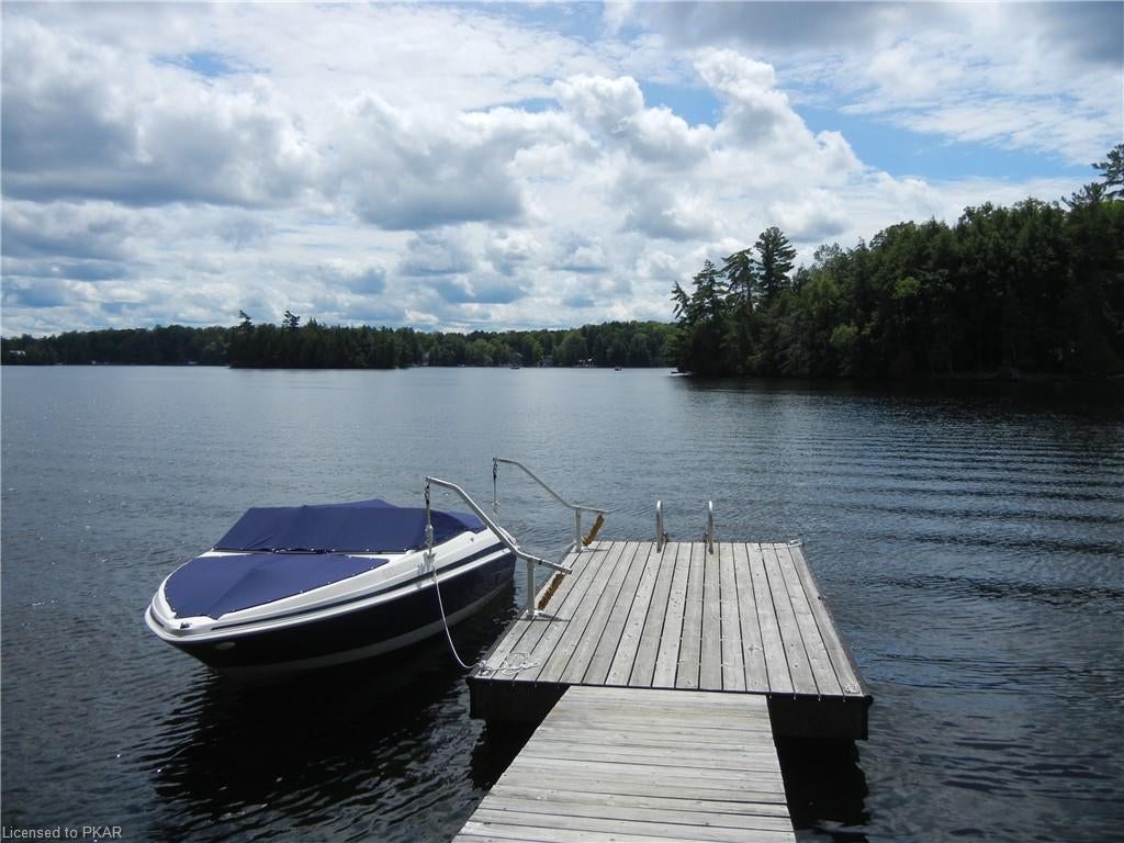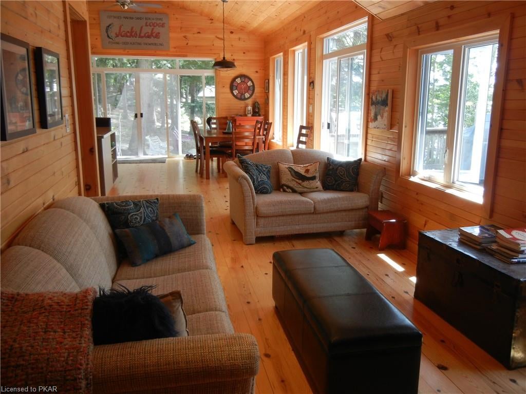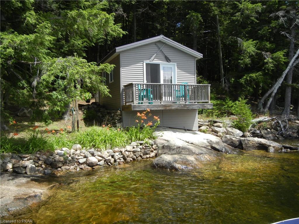 Nestled in the woods you'll find a spectacular cottage. A nicely sloping lot offers beautiful water frontage with southwestern exposure. This fully updated and renovated Four seasons cottage boasts an open-concept great room with a spacious custom design kitchen that has a large island and granite counter tops. There are three main floor bedrooms and a large 3-piece bathroom with main floor laundry facilities. In addition, there are three excellent outbuildings one of which is a Lakeside boat house with pine floors. The property offers exceptional privacy, with professional landscaping, a dock and beautiful calming lake views from both inside and outside of the cottage. All of this abutting crown land on beautiful Jack Lake only minutes from the full service Village of Apsley.