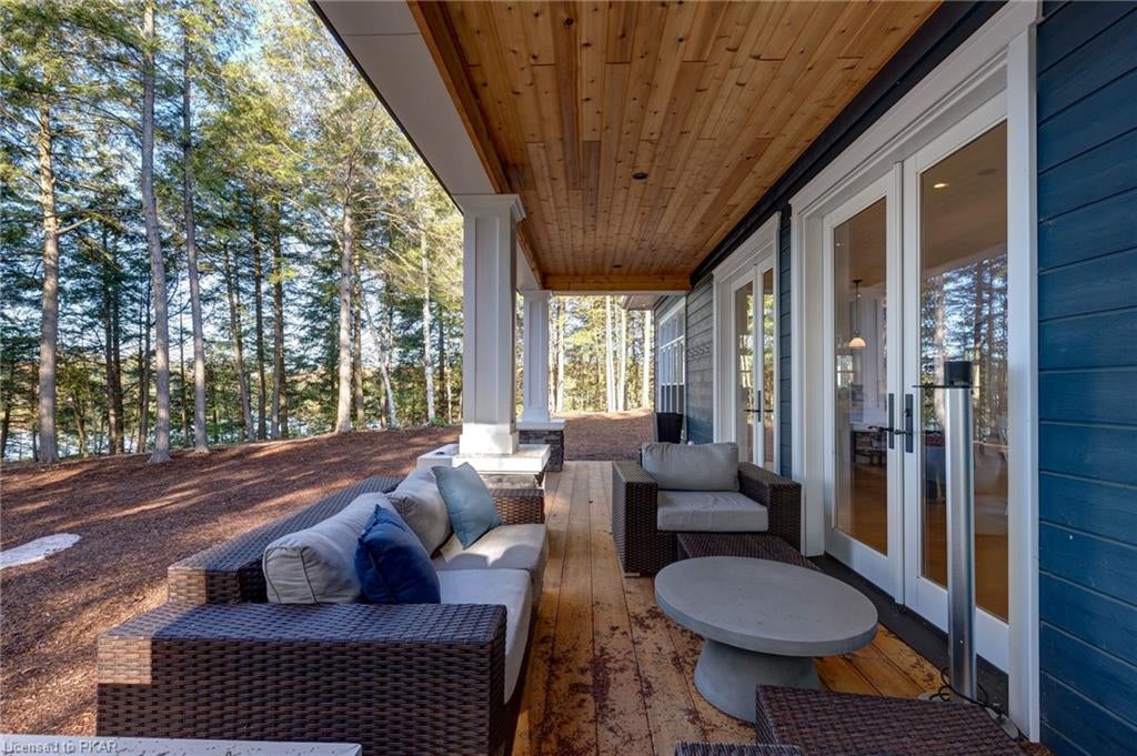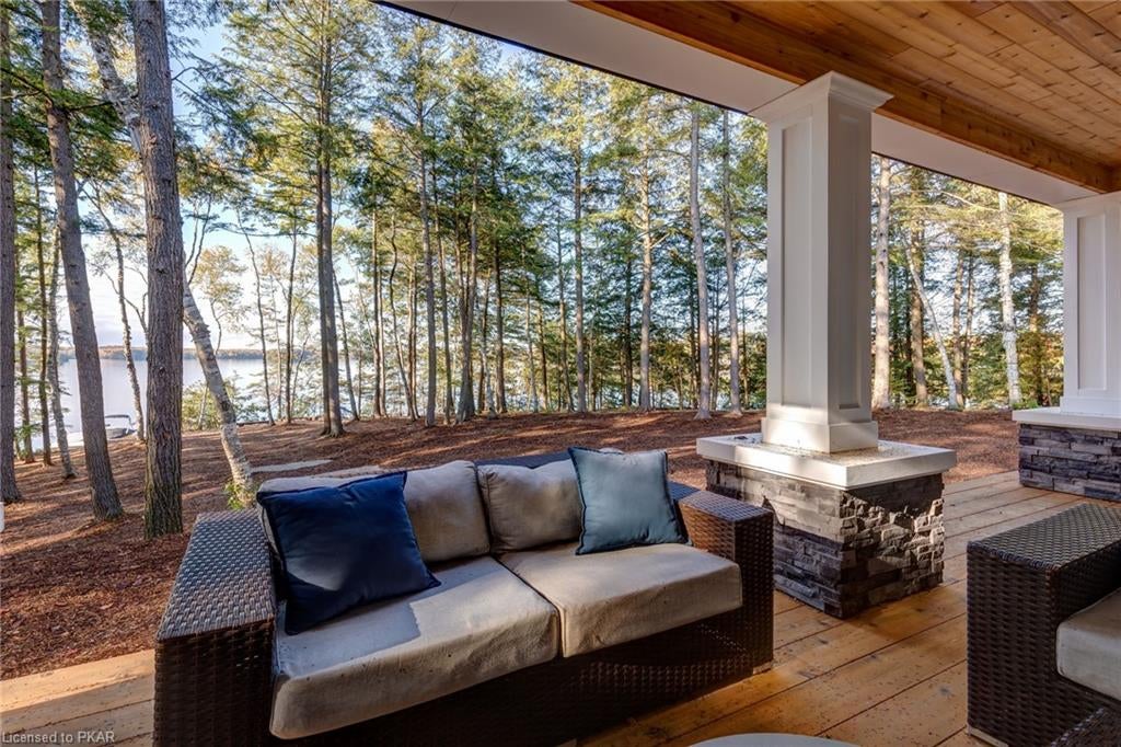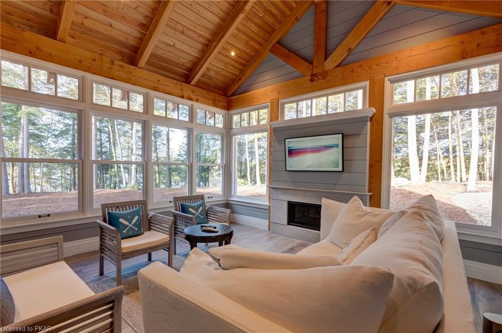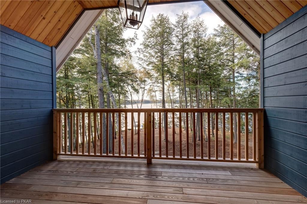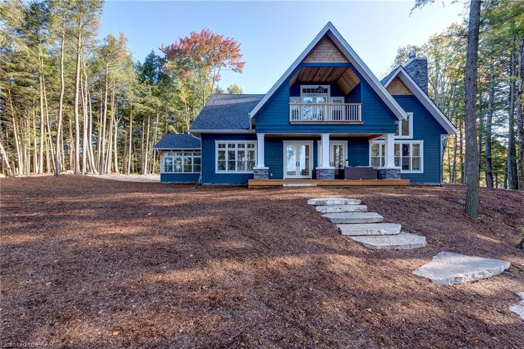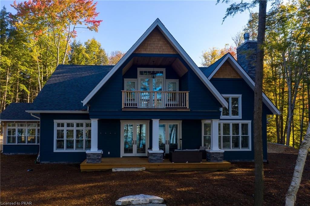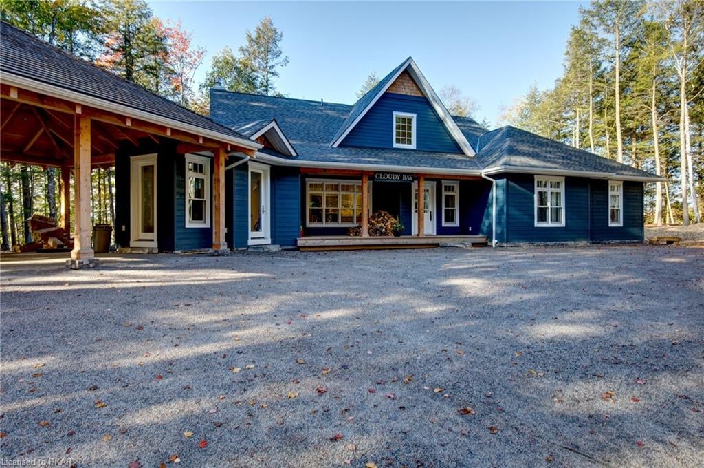 Nestled in the woods you will find a spectacular new 4 season cottage/ home. A gently sloping lot offers extreme privacy with 8.6 acres and 830 feet of excellent water frontage with western exposure. This new build boasts open concept living with a vaulted ceiling and stone fireplace. The spacious custom designed kitchen has all new top of the line Subzero and Wolf appliances, quartz counter tops, ceramic back splash, and under cabinet low voltage lighting. A spacious dining area and access to a beautiful three season room with gas fireplace complete the living space. Also on the main floor is the laundry area complete with a dog washing station, interior access to the large carport, three large bedrooms and 2.5 bathrooms. The second floor offers a large primary suite with a large bedroom, walk in closet, lakeside deck, and a beautiful primary en suite with a separate toilet closet.