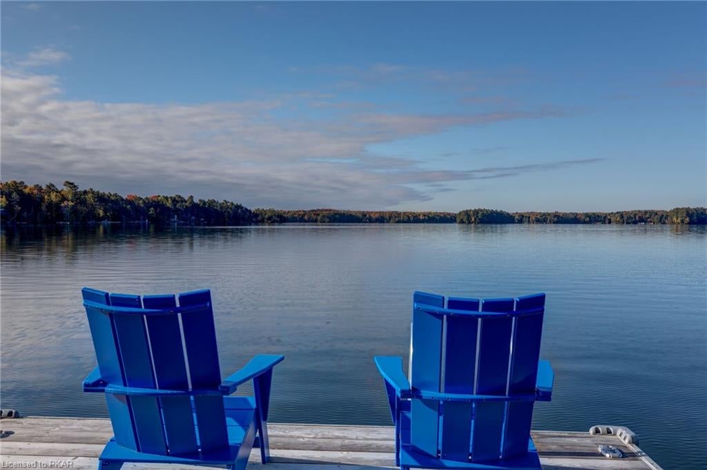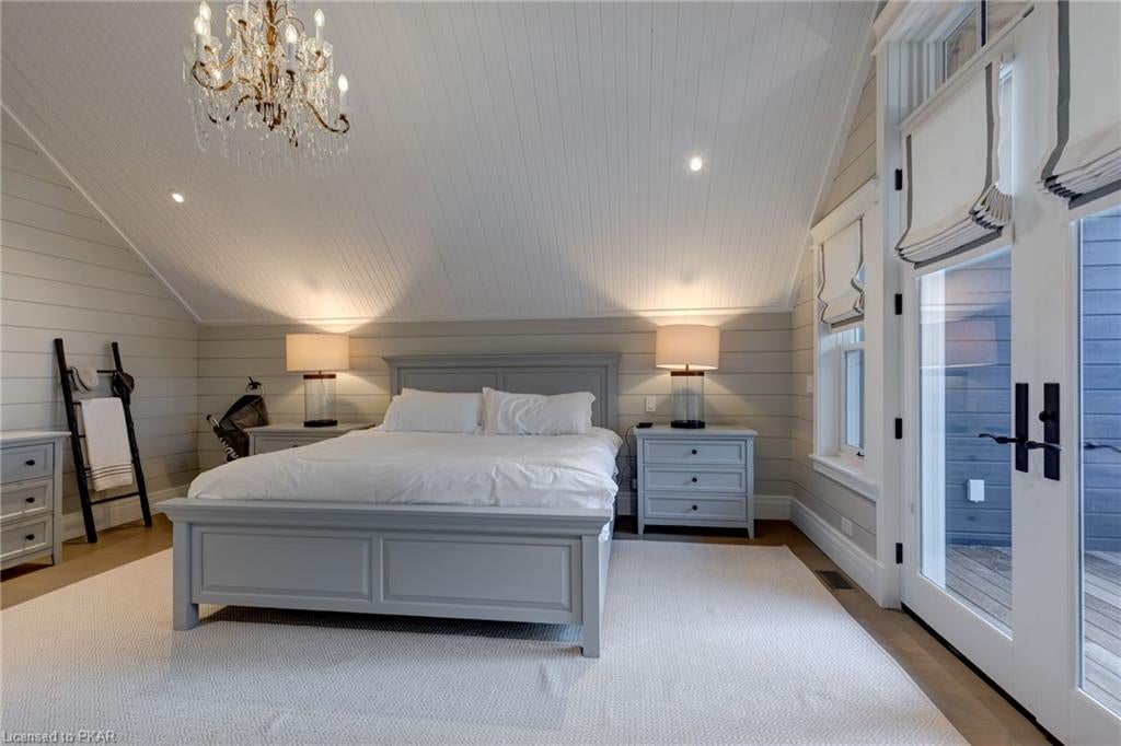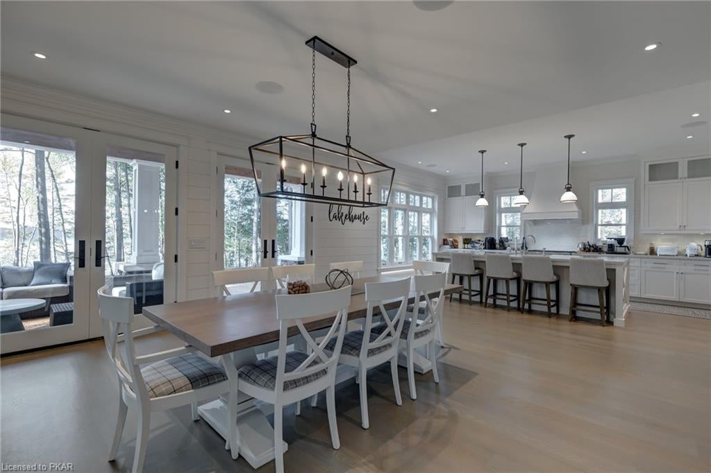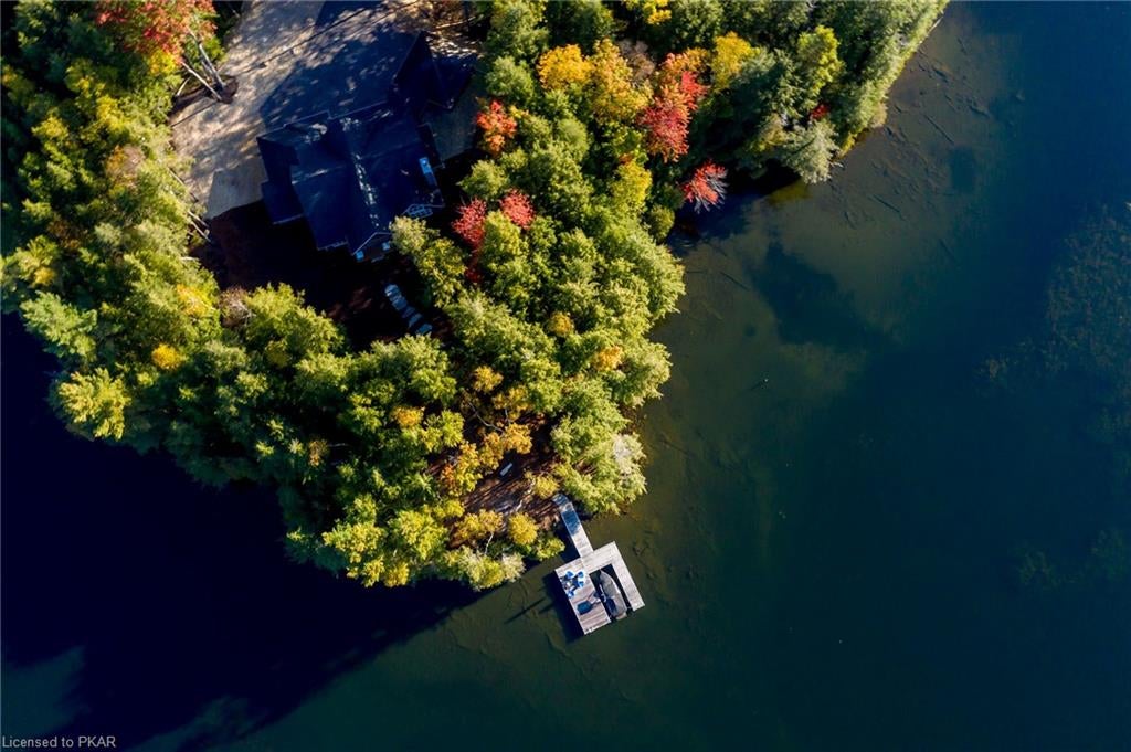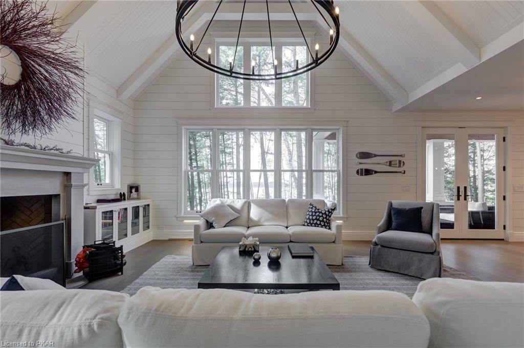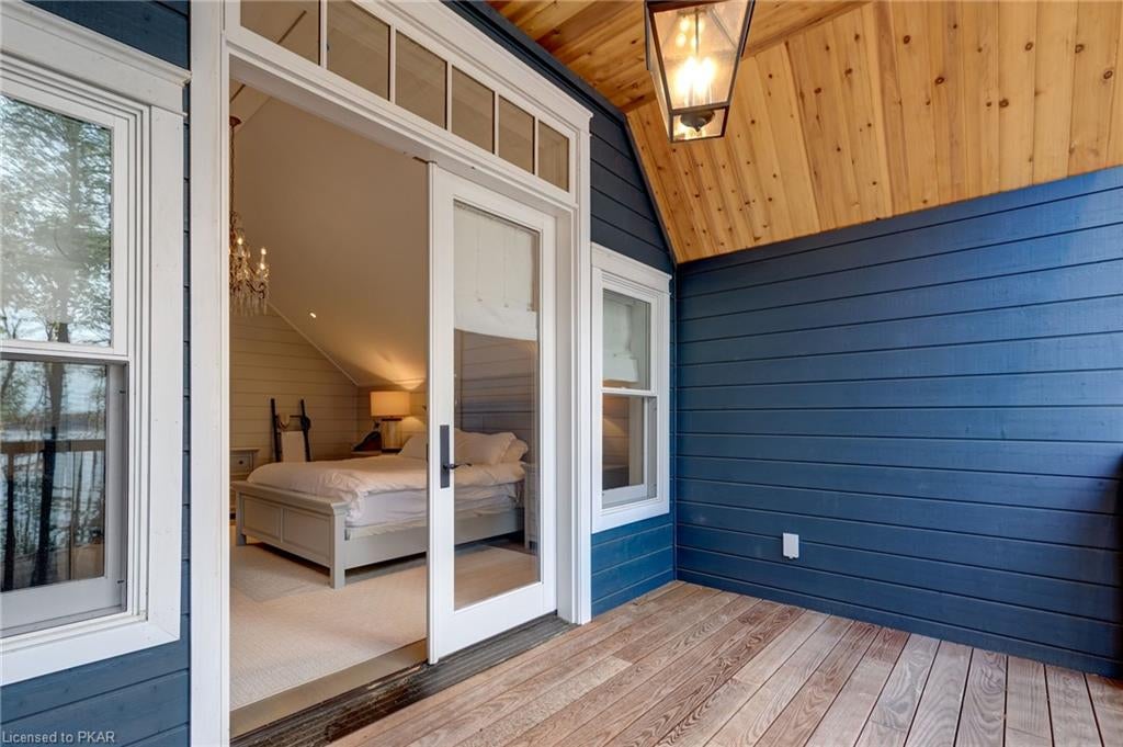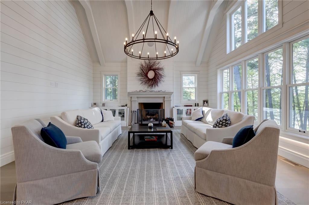 Nestled in the woods you will find a spectacular new 4 season cottage/ home. A gently sloping lot offers extreme privacy with 8.6 acres and 830 feet of excellent water frontage with western exposure. This new build boasts open concept living with a vaulted ceiling and stone fireplace. The spacious custom designed kitchen has all new top of the line Subzero and Wolf appliances, quartz counter tops, ceramic back splash, and under cabinet low voltage lighting. A spacious dining area and access to a beautiful three season room with gas fireplace complete the living space. Also on the main floor is the laundry area complete with a dog washing station, interior access to the large carport, three large bedrooms and 2.5 bathrooms. The second floor offers a large primary suite with a large bedroom, walk in closet, lakeside deck, and a beautiful primary en suite with a separate toilet closet.