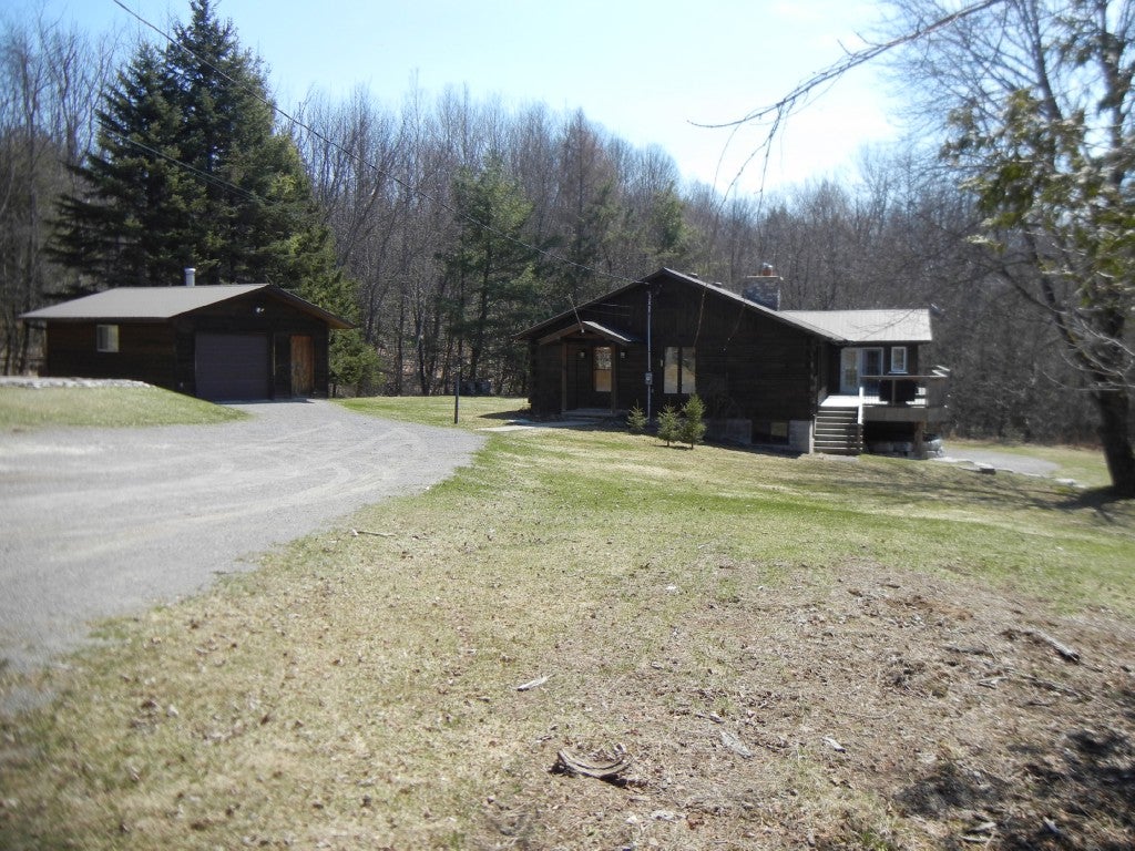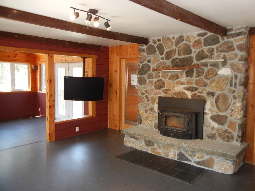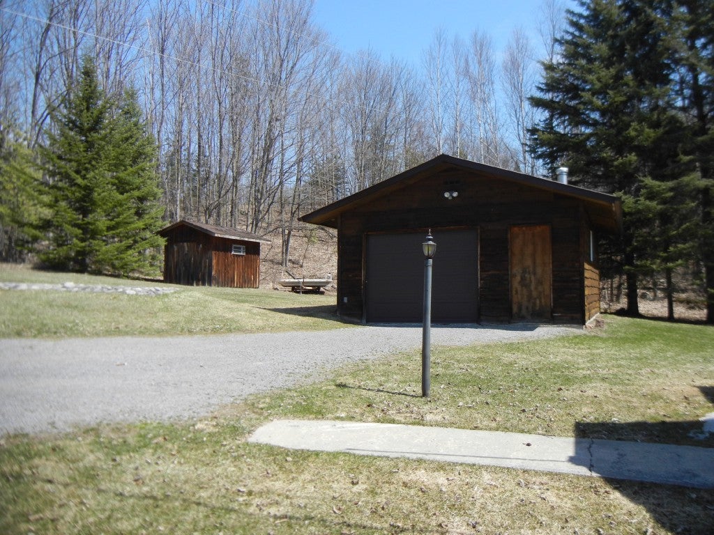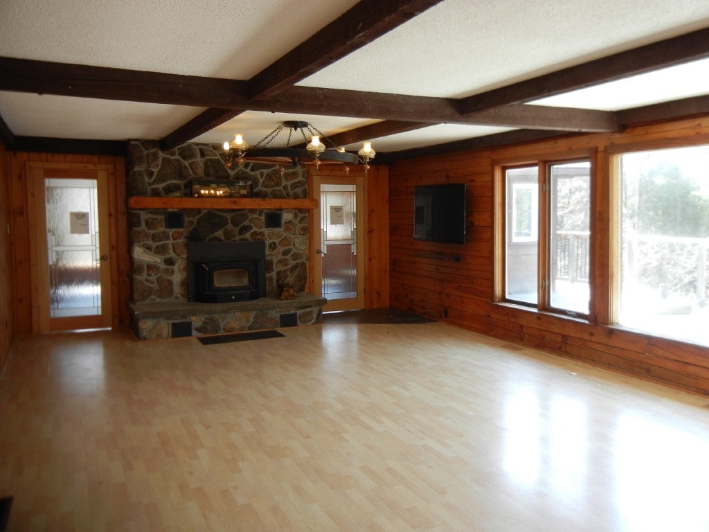 A four season log cottage or home featuring 3 bedrooms, renovated 5 pc bath, 2 garages for recreational toys, large entertaining spaces in this cottage with a wrap around deck. Clean waterfront and great privacy on 6 acres, well treed and four season road access are just some of the property`s features.